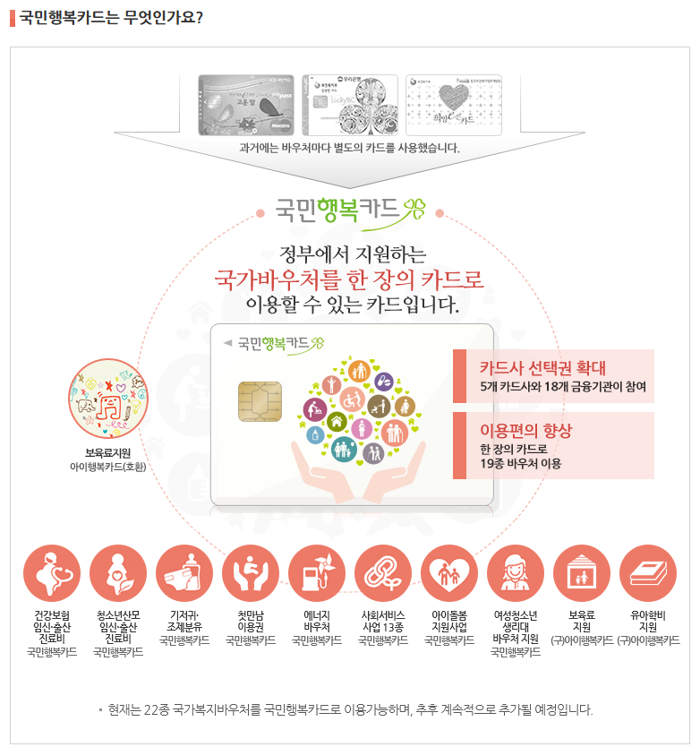 하지만 국민행복카드는 다릅니다. 생애주기별로 필요한 바우처를 하나의 카드로 통합해 사용할 수 있도록 한 시스템이기 때문에 훨씬 실용적입니다.