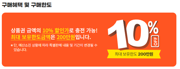 구매혜택 및 구매한도 : 상품권 금액의 10% 할인가로 충전 가능!