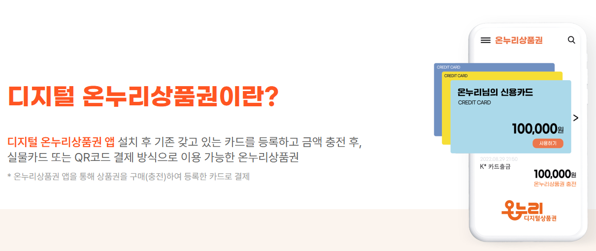 디지털 온누리상품권 앱 설치 후 기존 갖고 있는 카드를 등록하고 금액 충전 후, 실물카드 또는 QR코드 결제 방식으로 이용 가능한 온누리상품권입니다.