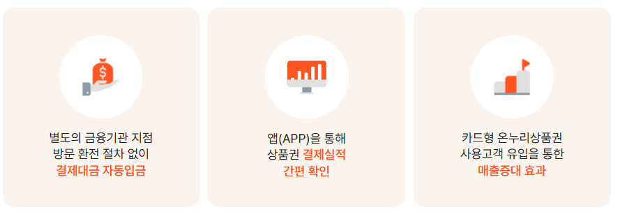 별도의 금융기관 지점 방문 환전 절차 없이 결제대금 자동입금되고, 앱(APP)을 통해 상품권 결제실적을 간편하게 확인할 수 있으며, 카드형 온누리상품권 사용고객 유입을 통한 매출증대 효과를 누릴 수 있습니다.