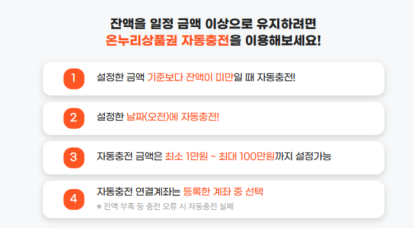 - 온누리상품권의 자동충전 기능을 이용하시면 편리하게 잔액을 일정 금액이상으로 유지할 수 있습니다.