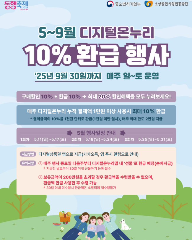 중소벤처기업부는 이 기간 동안 디지털 온누리상품권 사용자 대상 환급 이벤트를 시행합니다.
