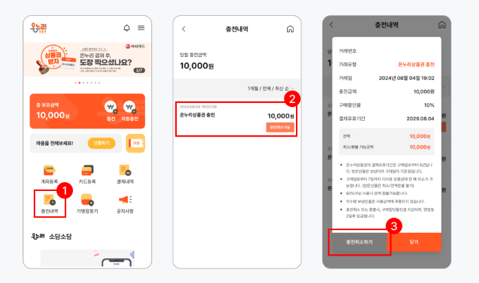 - 구매 후 7일 이내 미사용 충전 금액 한해 '앱의 홈 화면 > 충전 내역 > 충전 내역 상세'에서 취소 가능하며, 기한 지난 경우 충전 취소가 불가합니다.