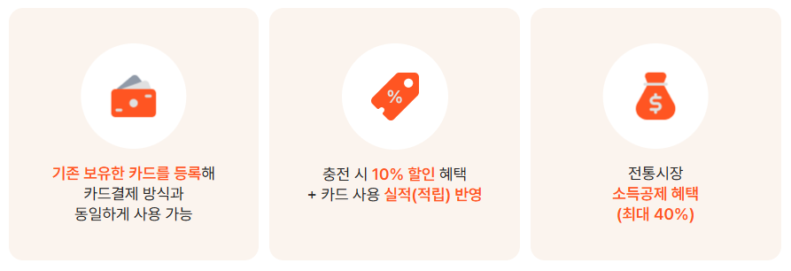 기존 보유한 카드를 등록해 카드결제 방식과 동일하게 사용 가능하고, 충전 시 10% 할인 혜택 + 카드 사용 실적(적립) 반영되며 전통시장 소득공제 혜택 (최대 40%)을 받을 수 있습니다.
