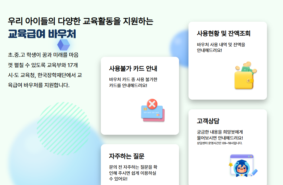 교육급여 바우처는 학생의 교육활동에 실질적으로 도움이 되는 소비를 유도하기 위한 카드형 포인트 지원금입니다.