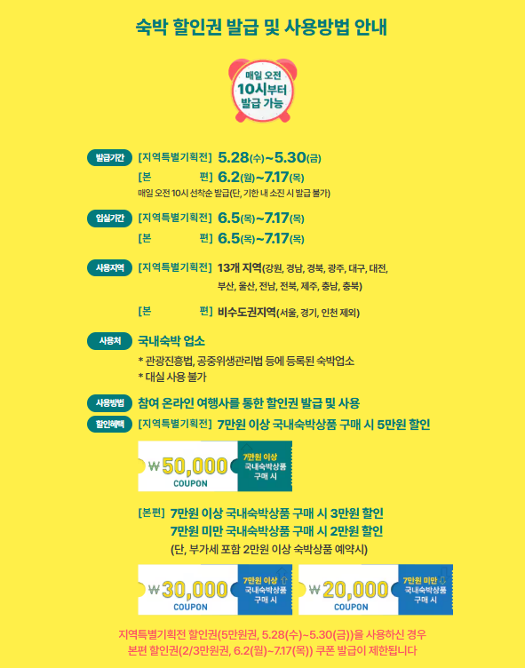 최대 5만 원까지 할인받을 수 있는 숙박 할인권을 선착순으로 제공합니다.