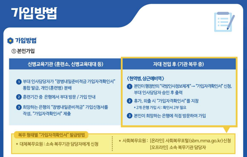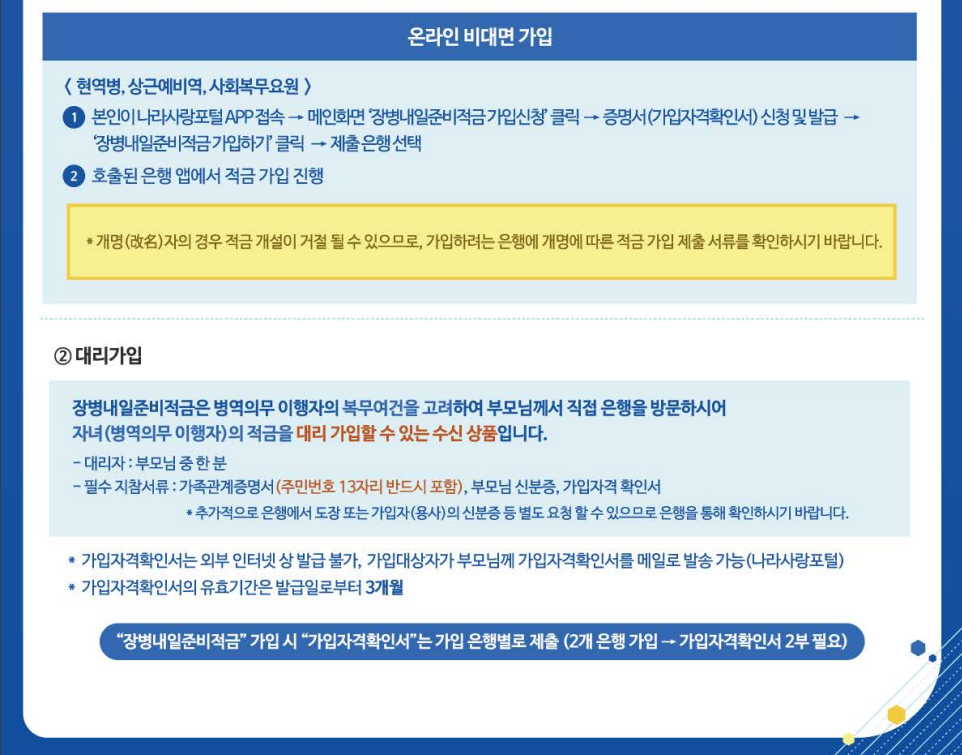 - 비대면 가입: ‘나라사랑포털’ 앱 접속 후 진행