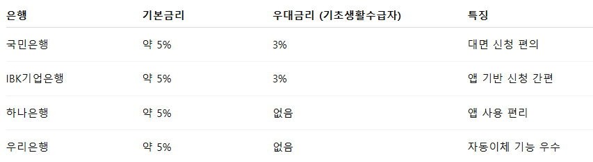 특별히 기초생활수급자인 경우에는 일부 은행을 통해 3%의 추가 우대금리도 받을 수 있어, 상황에 따라 혜택의 폭은 더욱 넓어집니다.