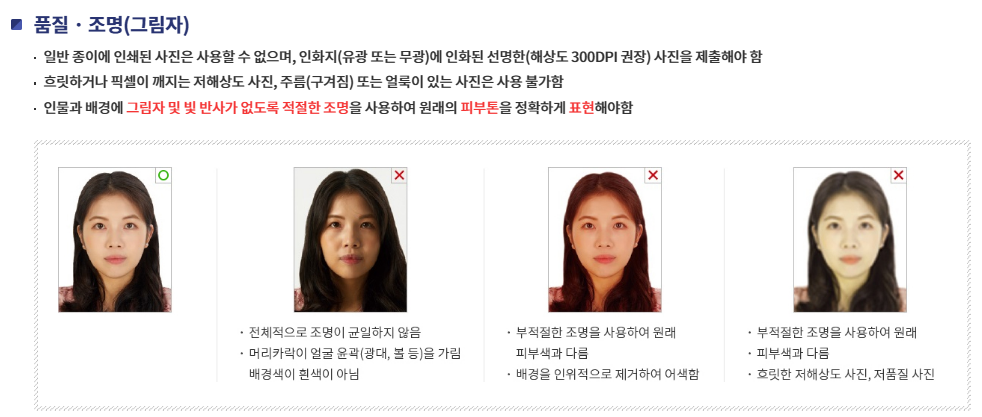 여권사진은 규격과 품질 요구사항이 매우 엄격하기 때문에 다음 조건을 반드시 확인해주세요.