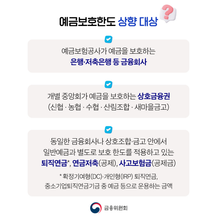 - 일반 예금뿐 아니라, 퇴직연금, 연금저축(공제) 등도 보호한도 1억 원으로 확대됩니다.