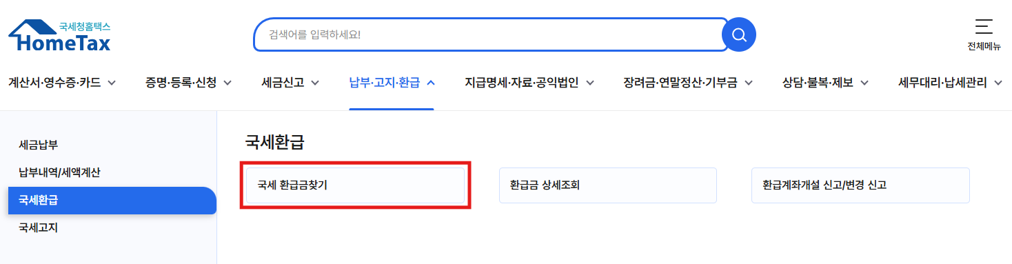 - 상단 메뉴에서 [조회/발급] > [국세환급] > [국세환급금 찾기]를 클릭합니다.