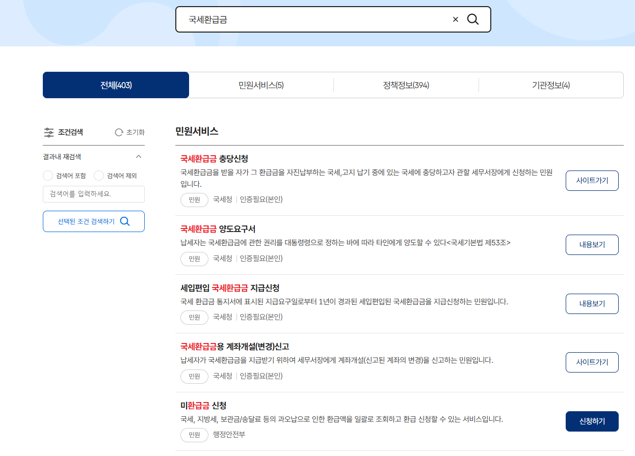 - ‘국세 미환급금 조회 및 신청’ 서비스를 클릭합니다.