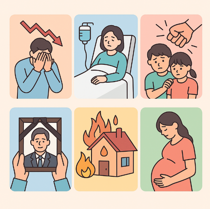 긴급생계지원금은 다음과 같은 ‘위기 상황’에 해당하는 경우 신청할 수 있습니다.