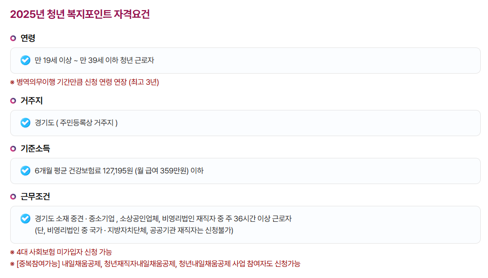또한, 기존에 이 제도를 통해 복지포인트를 받은 적이 있거나, 청년 노동자 통장, 중소기업 청년 노동자 지원사업에 참여한 이력이 있다면 중복 참여가 제한됩니다. 다만, 내일채움공제 같은 자산형성 사업과는 중복으로 참여할 수 있습니다.
