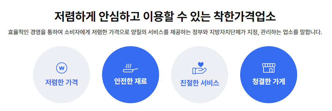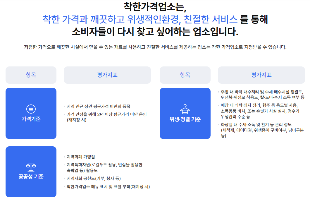 음식점뿐 아니라 미용실, 세탁소, 목욕탕 등 일상생활에 밀접한 다양한 업종이 포함됩니다. 해당 지역의 평균 가격보다 저렴한 서비스를 제공하고, 위생과 친절도 기준을 충족해야 하며, 주기적인 현장점검을 통과해야만 착한가격업소로 인증받을 수 있습니다.