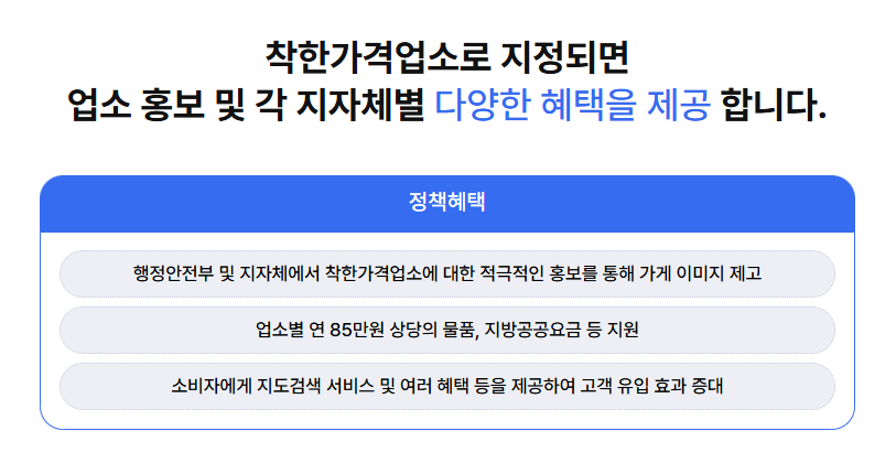 또한 일부 지자체에서는 착한가격업소에 대해 홍보 지원, 청소용품 지원, 간판 리뉴얼, 공공요금 일부 지원 등의 실질적인 지원을 하고 있어, 소상공인 입장에서도 참여할 유인이 충분합니다.