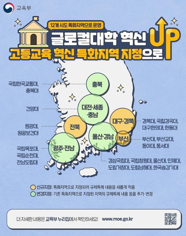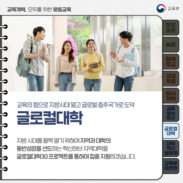 교육부는 2024년부터 5년간 전국 30개 대학을 선정하여 ‘글로컬 대학’으로 육성하는 ‘글로컬대학 30 프로젝트’를 추진하고 있습니다. 선정된 대학은 연 최대 100억 원 이상의 국고지원을 받고, 지역과 대학, 산업이 함께 만드는 협력 생태계를 구축하게 됩니다.
