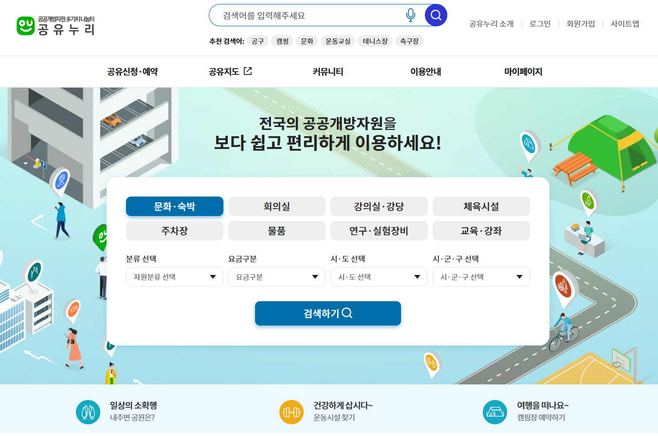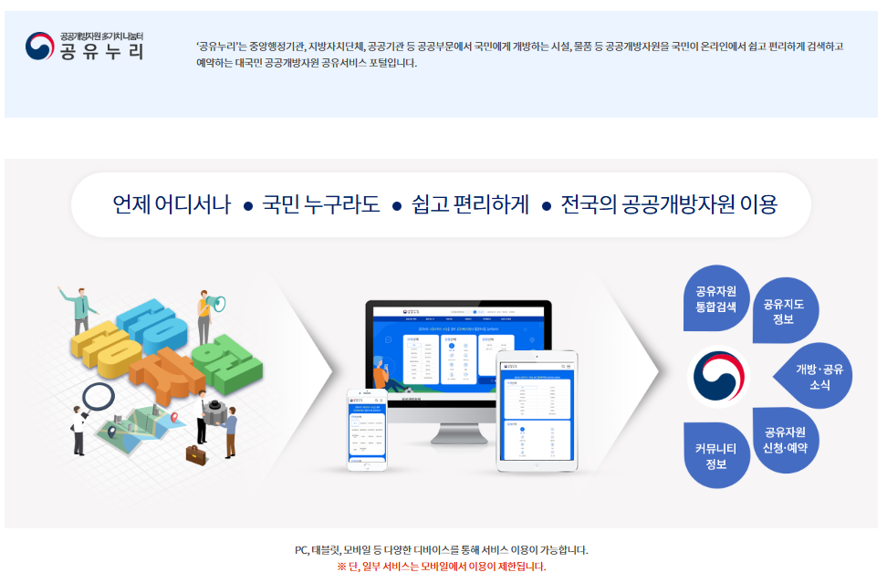 각종 공공기관에서 유휴 상태로 보유 중인 회의실, 강당, 체육관, 실험 장비, 주차장, 교육 공간 등을 국민에게 개방하고, 누구나 쉽게 예약해 사용할 수 있도록 만들어진 시스템입니다.