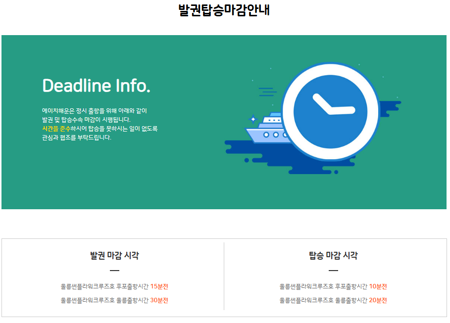 - 승선 최소 1시간 전 도착이 추천되며, 차량 소유자는 2시간 전 승선 수속을 하는 것이 안전합니다.