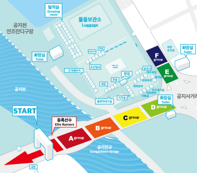 대회 당일 시작은 오전 9시며, 출발 1시간 전인 오전 8시까지 공지천 인조잔디구장에 집결해야 합니다. 도착 후 QR 체크를 통해 번호표와 안전용품이 배부되며, 풀코스 참가자는 출발 그룹에 따라 정렬하게 됩니다.