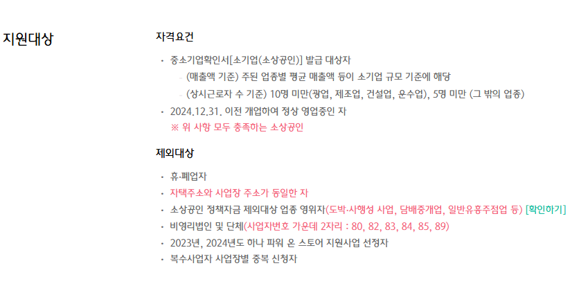 이 사업은 2024년 12월 31일 이전 개업한 개인사업자 중에서 중소기업확인서를 갖춘 소상공인이라면 누구나 신청 가능합니다. 상시 근로자 수가 해당 업종 기준을 만족해야 하며, 도박·유흥·담배중개 등 정책자금 제외 대상 업종이나 비영리법인은 제외됩니다. 하나의 사업장은 대표 1인만 신청 가능하며, 중복지원은 불가하므로 신중한 선택이 필요합니다.