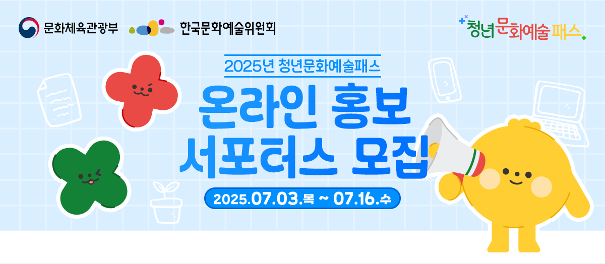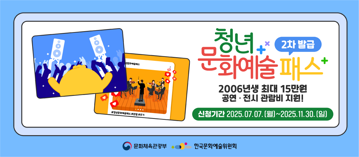 문화체육관광부와 한국문화예술위원회가 7월 7일부터 11월 30일까지 ‘청년문화예술패스’ 발급 추가 신청을 공식 홈페이지에서 선착순으로 진행합니다.